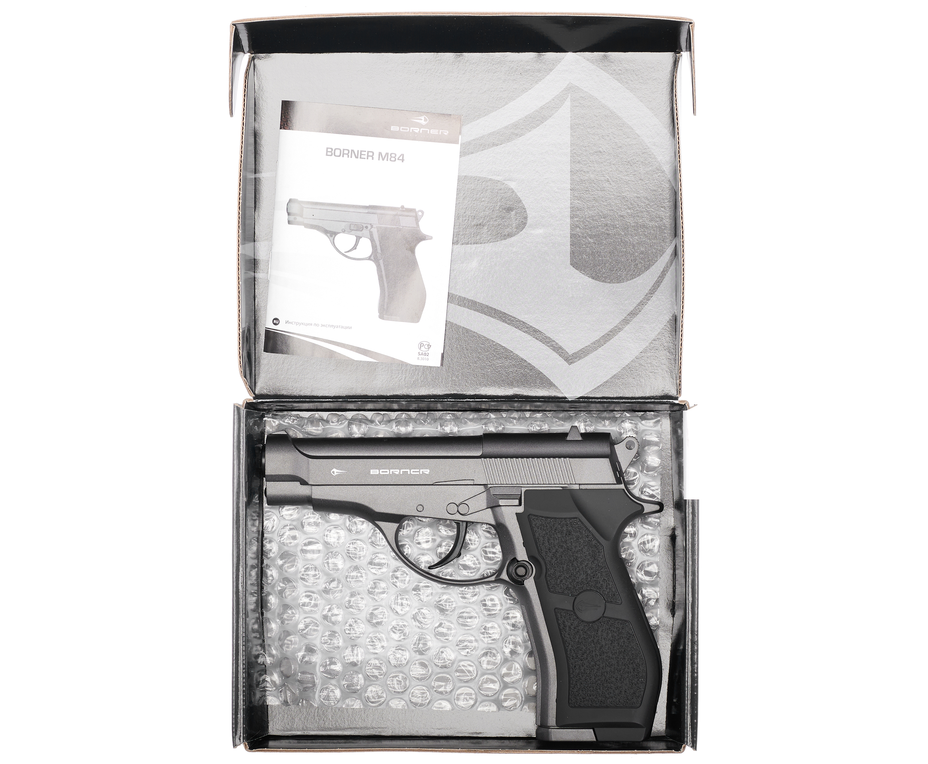 В каждый заказ мы вкладываем Сертификат соответствия к пневматическому пистолету Borner М84, гарантирующий качество изделия. А так же в сертификате указана информация что данный товар не требует регистрации, особых условий к владению, хранению и перевозке. Изделие является КСОИ, с дульной энергией не более 3 дж.